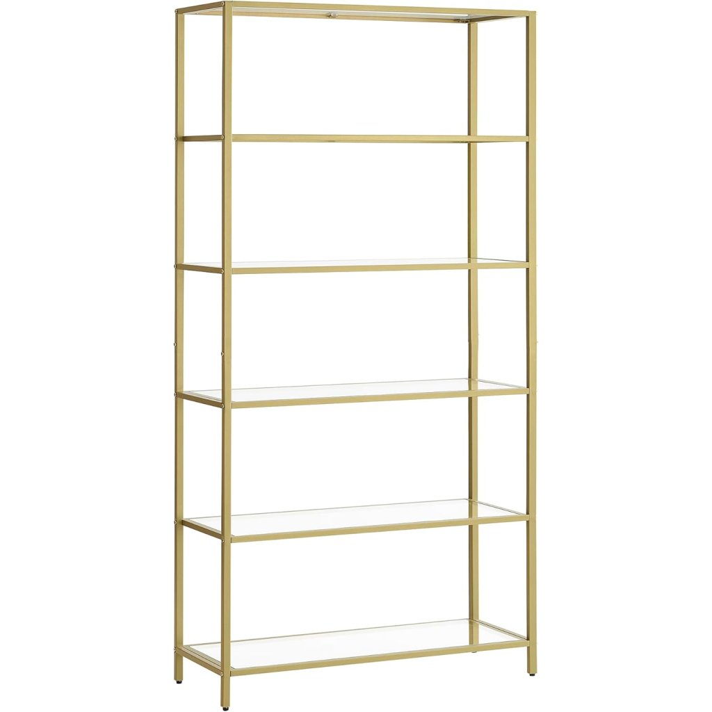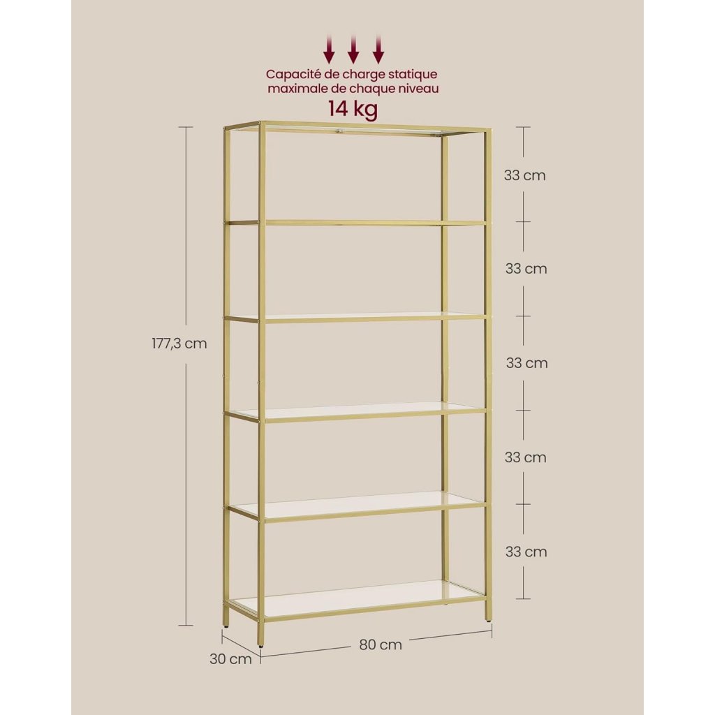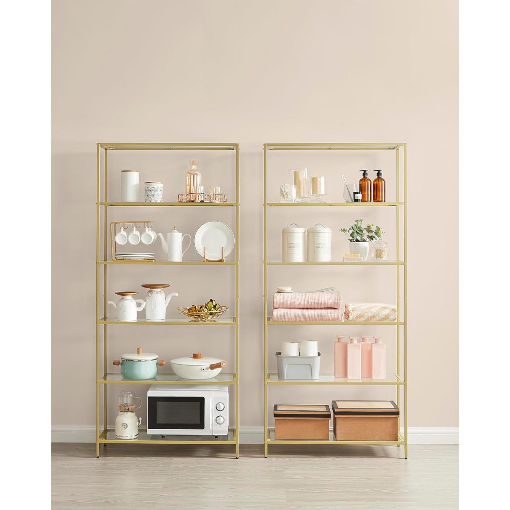 Knihovna / regál Dalby - sklo + kov - 6 polic - zlatá | 177,5x80x30 cm