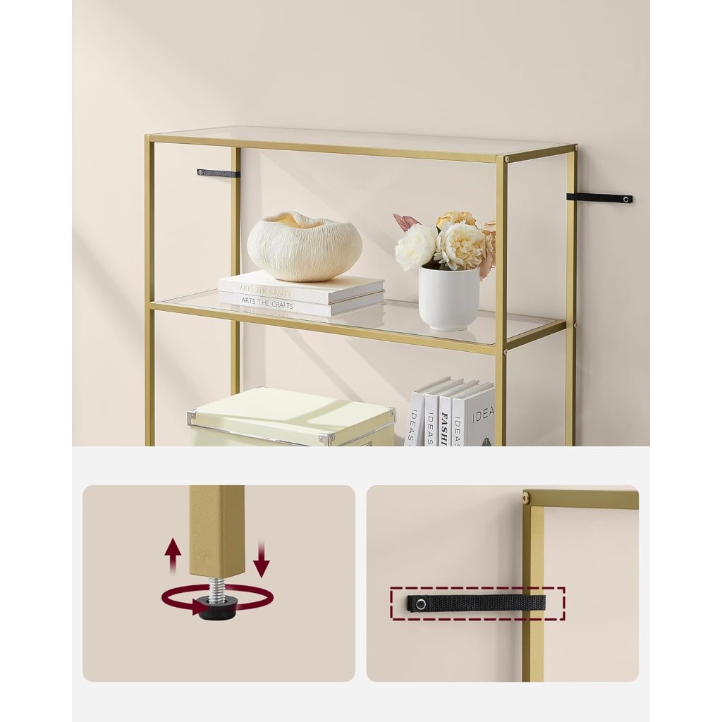 Tato knihovna Dalby přináší minimalistický design s industriálním nádechem. Kombinace zlatého kovového rámu a polic z tvrzeného skla vytváří elegantní a zároveň odolný kus nábytku, který se hodí do různých interiérů.