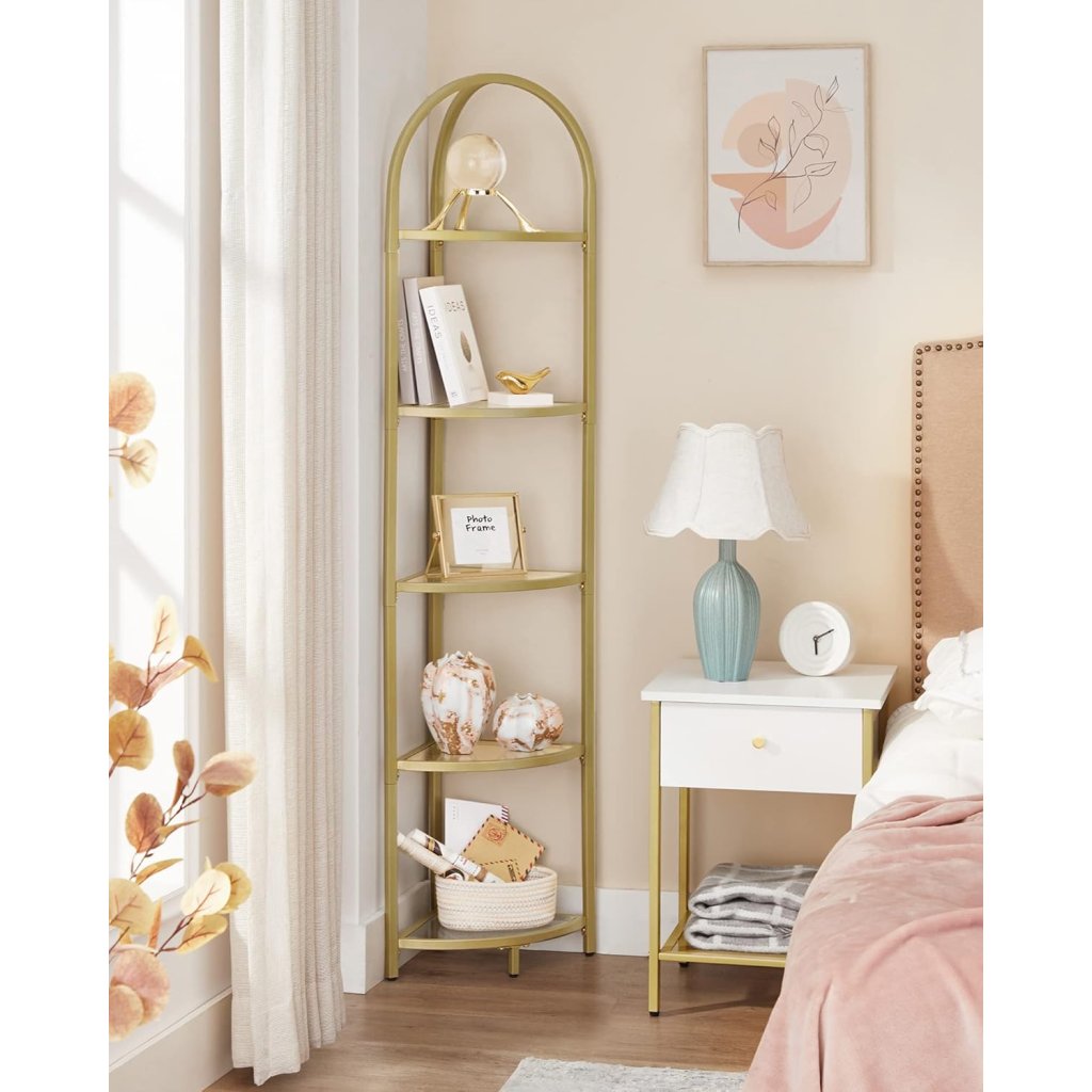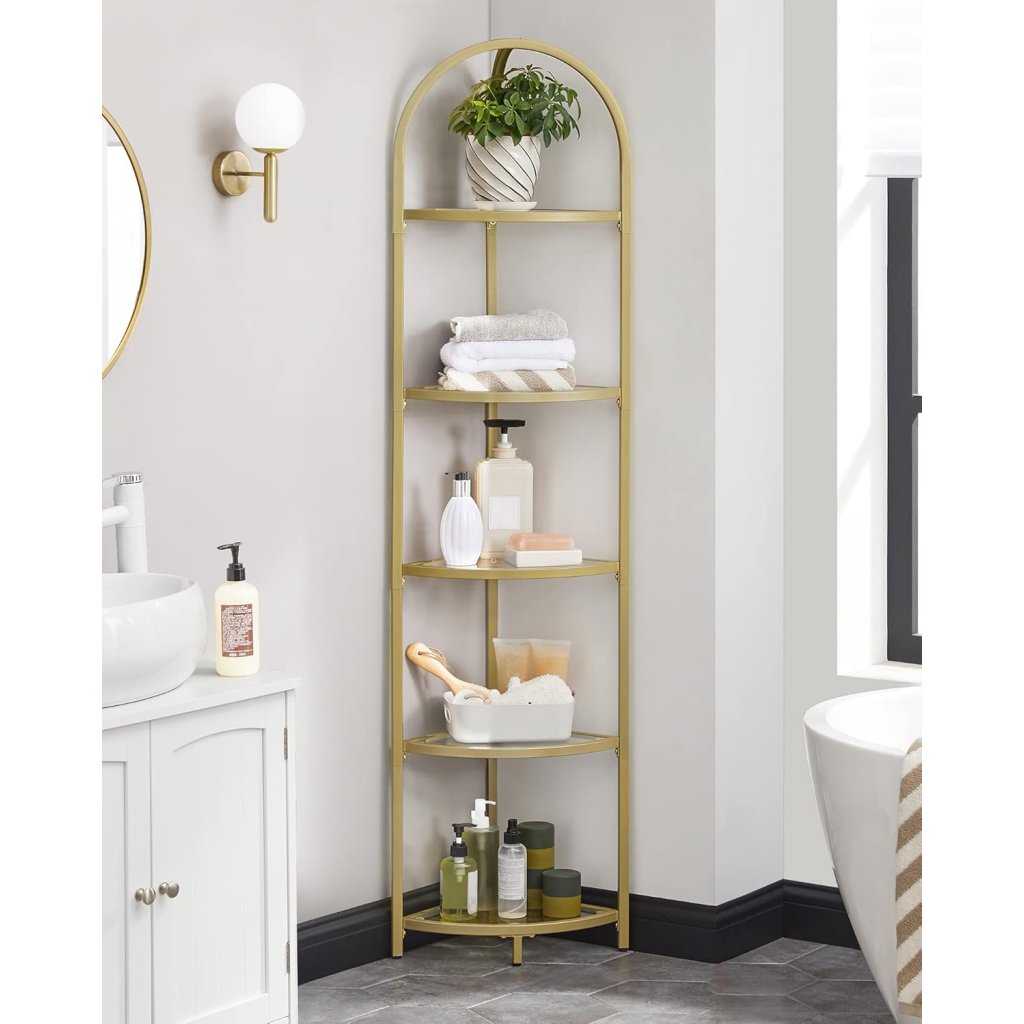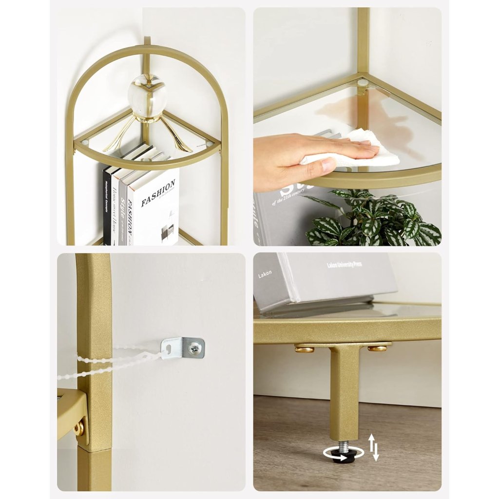 Elegantní rohová knihovna VASAGLE LGT810A01 spojuje luxusní design se skleněnými policemi a zlatým rámem. Je ideální volbou pro ty, kteří chtějí dodat interiéru šmrnc a zároveň efektivně využít prostor v rohu místnosti – ať už v obýváku, koupelně nebo ložnici.