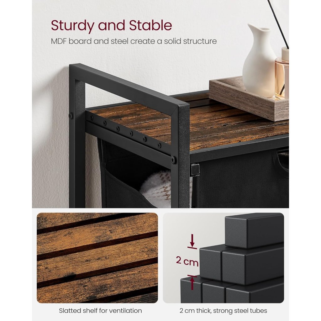 Tento koš na prádlo od značky VASAGLE kombinuje funkčnost a moderní design. Díky své kompaktní velikosti a tmavému provedení se hodí do každé koupelny, ložnice nebo prádelny. Horní police poskytuje další úložný prostor pro prací prostředky nebo dekorace.