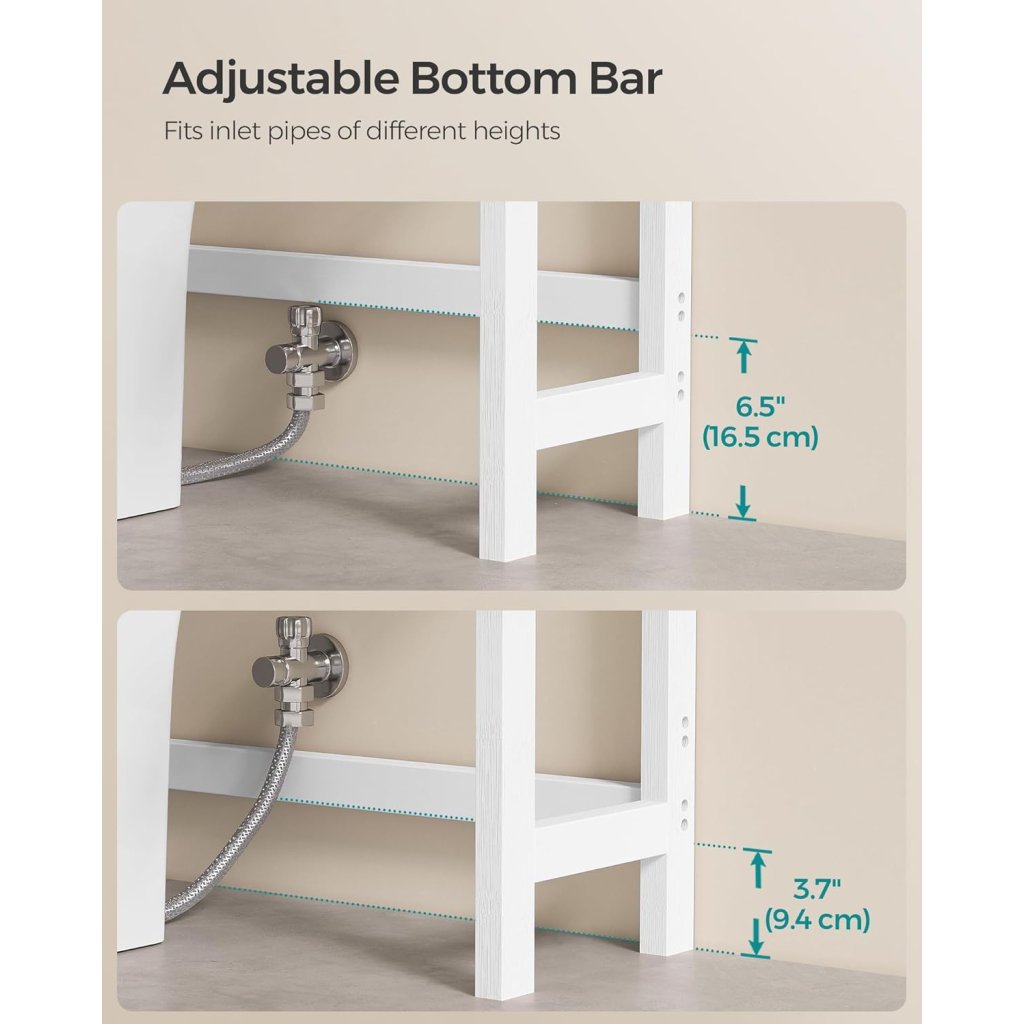 - Přizpůsobení podle potřeby: Prostřední poličku lze nastavit do tří výšek, spodní příčku lze umístit 9,5 nebo 16,5 cm nad podlahu – ideální pro různé typy toalet.