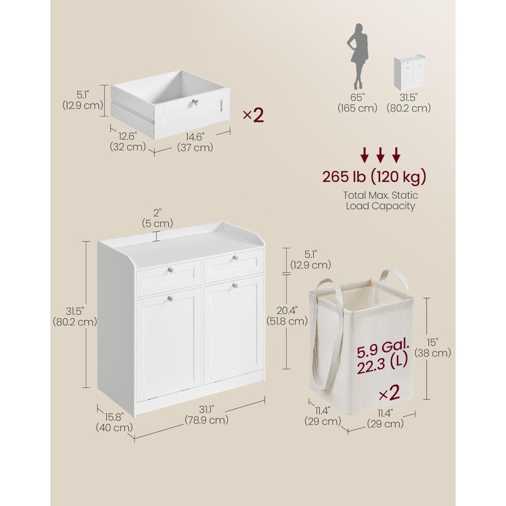 Spojte styl a praktičnost s touto prostornou koupelnovou skříňkou VASAGLE BBC751W01 s dvojitým košem na prádlo. Nabízí nejen horní polici a dvě zásuvky pro snadný přístup k toaletním potřebám, ale také dvě samostatné výklopné přihrádky s látkovými koši, které vám usnadní třídění a přenášení prádla. Tento multifunkční kus nábytku přináší elegantní vzhled, snadnou údržbu a vysokou nosnost, což z něj činí ideální doplněk do každé moderní koupelny.