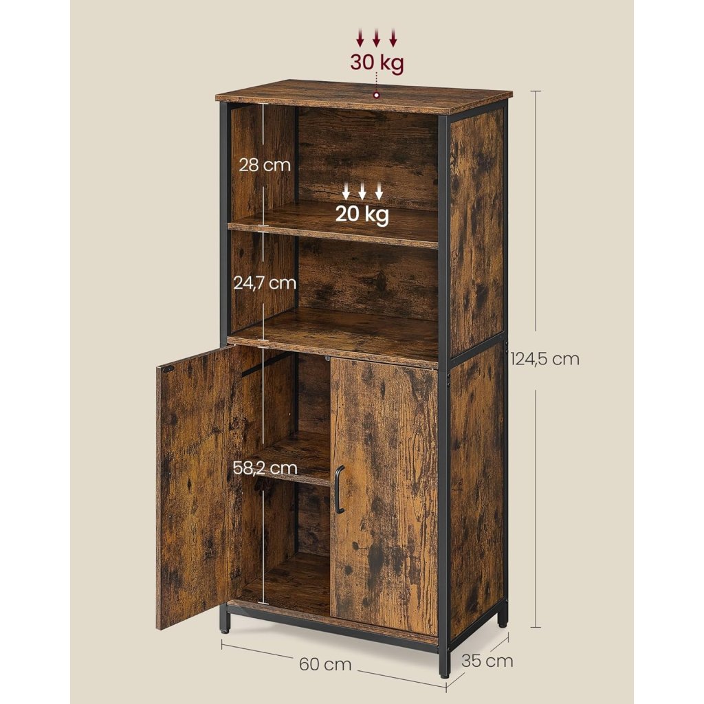 - Velký úložný prostor: Dvě otevřené přihrádky a dvě police skryté za dvířky nabízejí dostatek místa pro knihy, nádobí, dekorace nebo kancelářské potřeby.