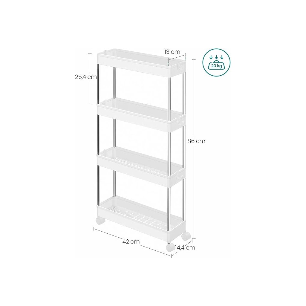 Praktický úzký regál Ringval v bílé barvě vám pomůže maximálně využít i ty nejužší mezery v kuchyni, koupelně nebo prádelně. Díky kompaktním rozměrům 86 × 42 × 14,4 cm se snadno vejde mezi skříňky nebo spotřebiče, a přitom nabídne překvapivě velký úložný prostor.