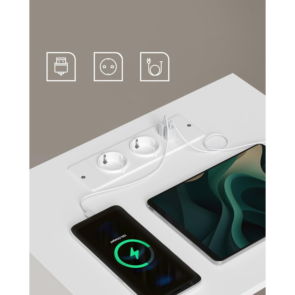 Stolek je vybaven vestavěnou nabíjecí stanicí se 2 USB porty a 2 zásuvkami, takže snadno nabijete telefon, tablet nebo jiná zařízení přímo z postele. Úložný prostor tvoří 2 otevřené police a zásuvka se zarážkou proti nechtěnému vysunutí – ideální pro uložení osobních věcí i dekorací.
