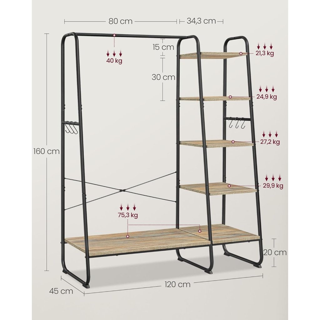 - Vše v jednom: Kombinuje šatní tyč, 5 otevřených polic, spodní polici na boty a 6 bočních háčků ve tvaru S – ideální pro přehledné uspořádání oblečení, doplňků i dekorací.