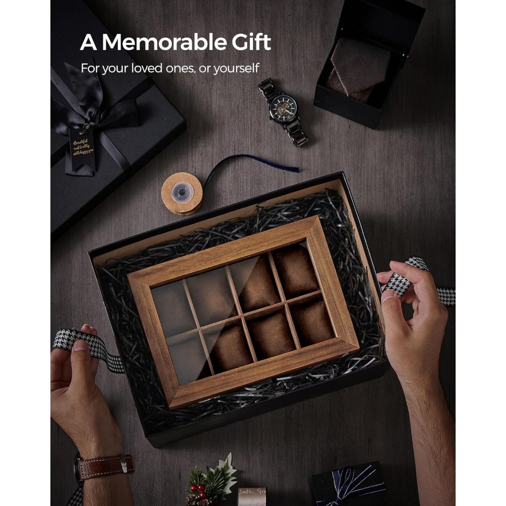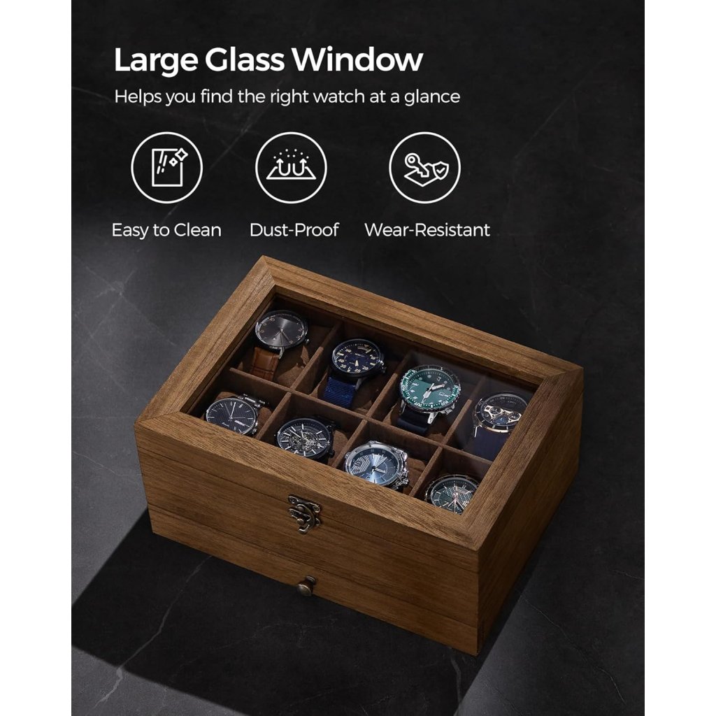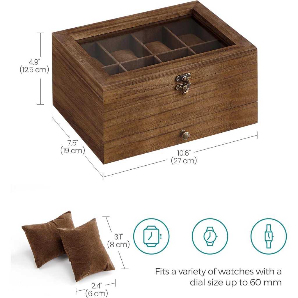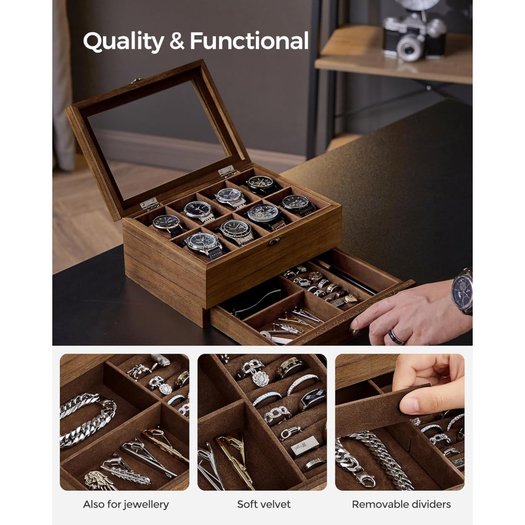 - Praktické uspořádání: Horní patro se 8 měkkými polštářky pro hodinky, spodní zásuvka rozdělená na menší přihrádky pro uložení šperků jako jsou náramky, prsteny či náušnice.
